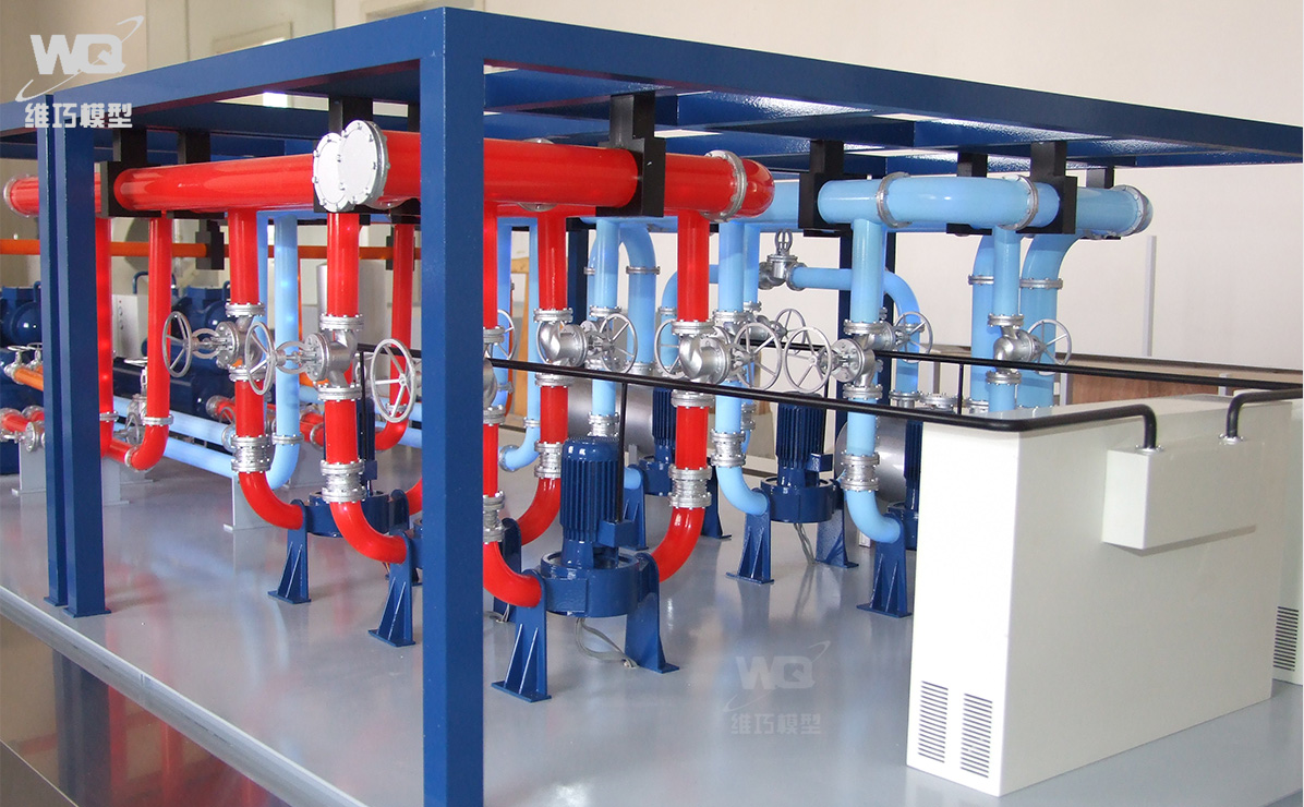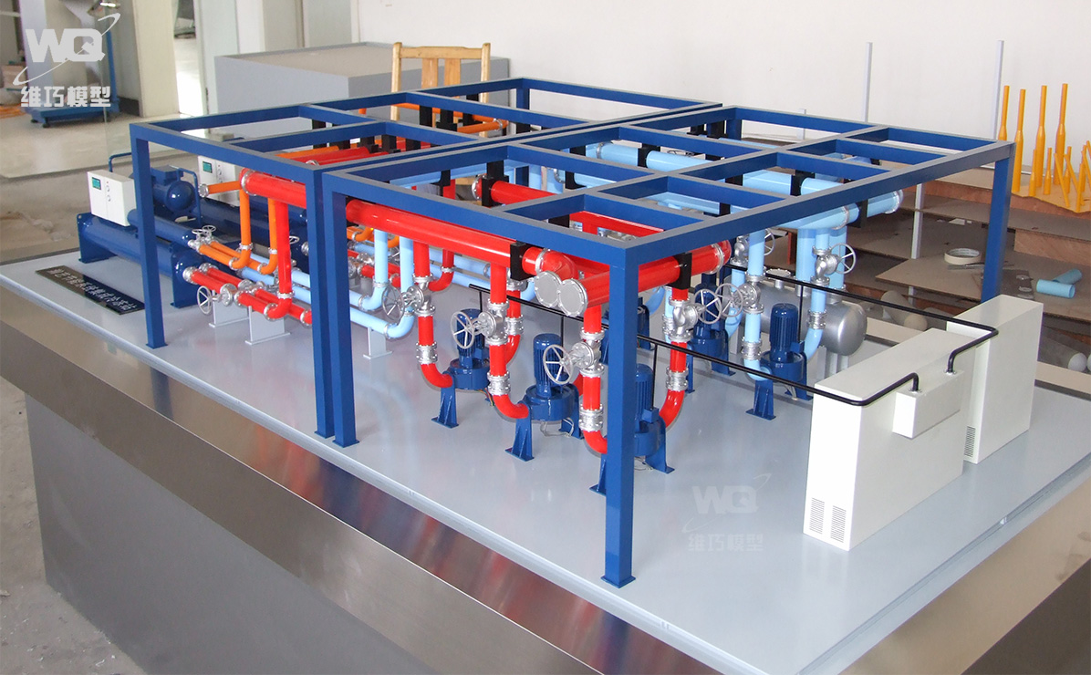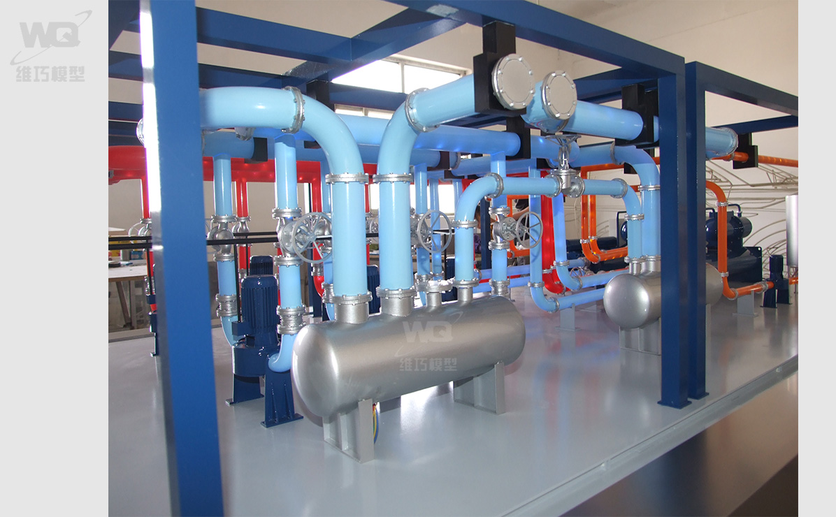 模型主體材質ABS工程塑料,CNC雕刻機加工制作,部件精細打磨,先底漆再分色金屬烤漆處理,真實原比例縮小(具體顏色根據甲方要求及3D圖為準)。LED跑馬燈模擬制冷劑流向